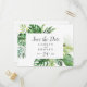Cette palme tropicale sauvage à l'exception de la carte postale date est parfaite pour un mariage de plage ou de destination. Le design comprend un éventail exotique de feuilles de bananiers d'aquarelle verte, fougères, feuillage, plantes botaniques et verdure pour une sensation tropicale estivale.