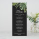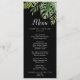 Cette carte de menu mariage sauvage de palmier tropical est parfaite pour un mariage sur la plage ou à destination. Le design comprend un éventail exotique de feuilles de bananiers verts aquarelles, fougères, feuillage, plantes botaniques et verdure sur un arrière - plan noir pour une ambiance estivale tropicale. Ce menu peut être utilisé pour une réception de mariage, un dîner de répétition ou tout événement.
