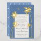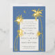 Ce faire-part de mariage boho serait parfait pour toute personne qui accueille un mariage tropical de destination ou toute personne qui veut une ambiance estivale crépusculaire pour son invitation. Le design présente des palmiers brillants en feuille d'or avec une lune et des étoiles sur un arrière - plan bleu doux avec et l'inverse de l'invitation a un motif étoile boho à assortir.