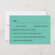 Customisez cette RSVP avec les détails de votre mariage. Ce design est une aquarelle d'une scène de plage avec des palmiers, un buisson fleuri et l'océan dans de beaux tons bleus. Personnalisez cette RSVP avec vos informations de mariage. L'arrière a de l'espace pour plus de détails. La couleur arrière - plan est un vert mousse de mer, vous pouvez changer la couleur ou l'enlever en cliquant sur le bouton Customiser. Ensuite, choisissez Modifier, Arrière - plan. Une palette de couleurs s'affiche. Une fois que vous avez choisi une autre couleur, vous devriez voir les changements immédiatement. Pour enregistrer vos modifications, cliquez sur Terminé.