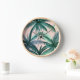 This pretty clock has a slight retro art deco Miami feel and features multiple palm trees in shades of blue green on a pale pastel pink coral background.