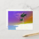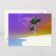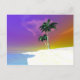 A postcard with my original artwork of a tropical island scene with a sandy white beach and palm trees.