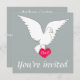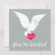 This gorgeous wedding invitation features a white dove on a gorgeous paloma background which is a lovely look for a wedding. The dove is also holding onto a red love heard which has initials in it which can be customized to be the bride and groom's initials and is a romantic touch to the front of the invitation. The back of the invite is a simple paloma grey coloured background with all the details of the happy event in white writing.