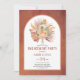 Tropical dried palm leaves, pampas grass and protea flowers terracotta arch engagement party invitation. This beautiful wedding design features an arch frame on terracotta stained background. In the frame there is a watercolor bouquet of dried palm leaves, protea flowers and pampas grass.