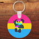 A keychain featuring a panda in pansexual/ panromantic pride flag colours (pink, yellow, and teal) with the pan flag as a background.