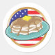 A stack of pancakes with syrup and butter and the American flag in the background. Customize this item with a name, comment or whatever you like to make it truly unique!