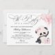 Adorable watercolor hand painted panda in pink bow and holding balloons baby It”s a girl baby shower invitation.