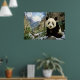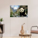 A Panda in the mountain.has a black and white panda sitting with with a forest view behind him and a trees around them and snow on the ground.this is a beautiful photo.