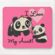 Two panda bears, one small and one adult, a pink heart, pink flowers, and text that reads I Love My Aunt on panda bear T-shirts, bags, mugs, buttons, cards, and other items.