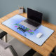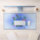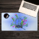 Ce tapis de bureau a un design abstrait de signe de paix bleu de couleur vive avec des rouleaux verts et bleus et des étoiles de tournage rose avec le texte Paix sur fond foncé à arrière - plan bleu clair.