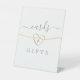 Élégant panneau de table de mariage blanc simple avec cœur de corde dorée fausse et écriture calligraphique moderne.