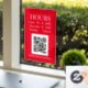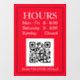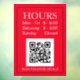 Panneau des heures d'ouverture avec code QR pour la porte ou la fenêtre d'entrée du magasin en texte blanc sur fond rouge avec message code QR.