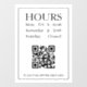 Panneau d'heures d'ouverture avec code QR pour l'entrée du magasin porte ou fenêtre en texte noir sur fond blanc avec message de code QR.