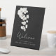 Orchidées Blanches Noires Modernes Panneau Mariage Floral - Design Botanique Monochrome Élégant. Faites une fête mariage grâce à notre panneau de table mariage moderne en noir et blanc qui présente l'allure intemporelle des orchidées blanches. Le design minimaliste saisit l'élégance de ces fleurs, créant ainsi un chef-d'oeuvre botanique sophistiqué. Avec l'ajout d'un script blanc, ces signes mariages dégagent un sentiment de beauté raffinée qui complète parfaitement l'esthétique moderne. Partagez la beauté de votre histoire d'amour avec votre famille et vos amis grâce à ces panneaux mariages élégants et captivants.