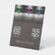 Élégant panneau de table pour barmans de mariage et d'évènement avec photo haut de lunettes à martini coloré avec texte personnalisable et codes QR sur arrière - plan gris.