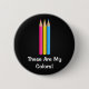 Classic Round Button with pencils in the colours of pansexuality rainbow flag of pink, yellow and blue; pan pride lgbtqiap+ design, "These Are My Colours" template text, by pinkbrickroad