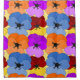 This shower curtain has a Spring design of purple, blue, orange, and red with yellow pansies layered on each other on a field of yellow.