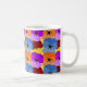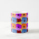 This mug has a Spring design of purple, blue, orange, and red with yellow pansies layered on each other on a field of yellow.