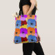 This tote bag has a Spring design of purple, blue, orange, and red with yellow pansies layered on each other on a field of yellow.