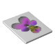 This awesome notepad features a photograph of a wild Pansy flower. The photo has been artificially coloured resulting in a pansy with light and dark shades of purple and a yellow and black centre centre. The background is pale grey.