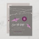 This modern zen wedding save the date announcement postcard features two origami purple paper cranes hanging from stylish minimalist strings of fairy lights against a dark grey background.