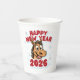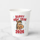 Celebrate the New Year 2026, the Year of the Horse, with this cheerful and bright graphic! It features a happy, cartoon horse mascot in a dynamic vector style. The main colors are vibrant red for the text (Happy New Year 2026) and brown/white for the horse, set against a background of white/gray snowflakes. This design is perfect for New Year's Eve T-shirts, party favors, and calendars. The target audience includes party-goers, people celebrating the Chinese Zodiac, and fans of cute, festive animal graphics. Festive Red & White New Year Horse Mascot