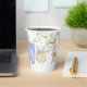 Paper cup for baby shower, decorated with beautiful watercolor illustrations of cute baby clothes hanging on a line to dry, a cute stuffed bunny surrounded by delicate branches with light green leaves.