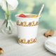 Bracket with "wrought iron" look is replicated in two rows at bottom and top of cup. Image is shades of gold and brown.