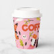 A paper coffee cup with an illustration of power and ghosts for Halloween in a flat style.