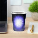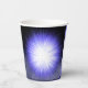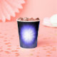 paper cup with black smokey background with a burst of purple and white light