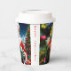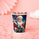 This paper cup features a festive red and green colour palette adorned with cheerful illustrations of Santa Claus and Christmas trees,. The design incorporates playful typography that spells out holiday greetings, adding a warm, inviting touch perfect for seasonal beverages and Christmas gifts . It evokes a cozy atmosphere, making every sip feel like a celebration.