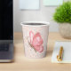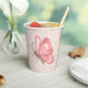 Painted pink butterfly on a bed of floral lace and blue confetti.Customizable text.