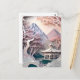 A lovely faux paper cutout landscape postcard with mountains, pavilion, and trees.
