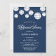 A whimsical and modern rehearsal dinner invitation featuring white hanging paper lanterns and elegant script on navy blue background. This invitation will be perfect for outdoor and nautical rehearsal dinners.
