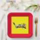 Dragon with green and white scales on body, gold and red spines on head, red tongue. Framed in red with yellow background.