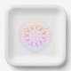 Rainbow coloured Mandala design with four pattern rings. Central circle of six segments, next circle has six ovals with circles inside. Eleven small sunbursts inside band that is trimmed with tiny circles. Fifteen diamond petals holding a circle create the outer ring. Simple, elegant design that is shown in pastel rainbow colours.