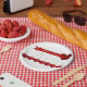 Simple but elegant, with red colors on a white background. Red set of fresh cherries and personalized text with heart as decoration. For birthday parties, parties and weddings a nice prop.