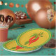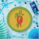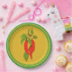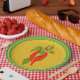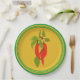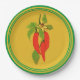 Hot chili peppers on mustard background. Mexican style. Perfect for party where Mexican food is served. Three border green rings. Chili peppers with green leaves on vine with small flower.