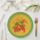 Hot chili peppers on mustard background with red text "Hot Chili Peppers" Mexican style. Perfect for party where Mexican food is served. Three border green rings.  Chili peppers with green leaves on vine with small flower.