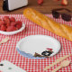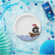 This is a festive paper plate for your parties. It features a pirate ship sailing on blue and white waves.