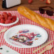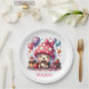 A cardboard plate featuring a happy mushroom, balloon holder, chocolate, and Friso cake, with a customizable name.