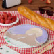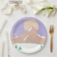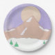 These paper plates are designed with a paper art depiction of a whimsical mountain in front of a full moon in a lavender sky.