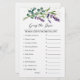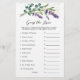 Baby shower Devine le jeu de prix. Cette conception présente une aquarelle illustrant les fleurs de lavande violette et le feuillage d'eucalyptus. Sur le dessus de la carte - confettis d'effet verdâtre. Ce jeu contient 10 doit avoir des articles bébé. Essayez de deviner le coût de chaque article.