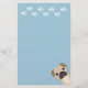Stationnaire heureux lumineux simple comportant une ligne des pawprints blancs le long du carlin supérieur et mignon jetant un coup d'oeil du coin inférieur droit.