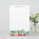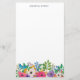 Joli papier à lettres personnalisé avec un papillon bleu assis dans une mer de fleurs colorées, baies et verdure. Roses roses, roses violets, fleurs sauvages en bleu et jaune et orange. Ajoutez votre nom en haut en lettres bleu marine.
