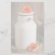 Papier papeterie à thème rustique. Une photo d'une cruche de lait blanc et de quelques fleurs d'orange placées autour de la boîte de lait. Assis dans une grange sur un foin. Panneaux en bois dans l'arrière - plan.