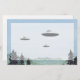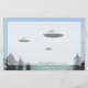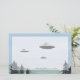 Aquarelle, stylo et encre, dessin au crayon de couleur de trois OVNI soucoupe au-dessus des montagnes.