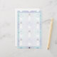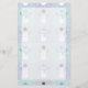 Quatre carrés de bleu pâle et de violet sont décorés de bonhommes de neige en chapeaux et vêtements d'hiver, comme des toboggans, des foulards et des mitaines. La couture blanche ajoute une touche décorative, donnant au motif répétitif l'aspect d'une courtepointe, créant une sensation de douceur pour l'hiver.