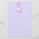 Papier à lettres avec une police tendance qui dit "salutations magiques" dans une police incurvée entourant une licorne kawaii mignonne dormant paisiblement avec une crinière et une queue frisées. Une étoile de tir en arc-en-ciel colorée au-dessus de sa tête. Set sur un arrière - plan pastel violet