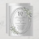 Un arrière - plan faux argenté. Décoré avec verdure et cadre ovale. Personnalisez et ajoutez un nom et des détails. Le numéro 10 est écrit avec une police de style de ballon à l'aspect faux argent. 1 feuille = 1 invite imprimé bord à bord.